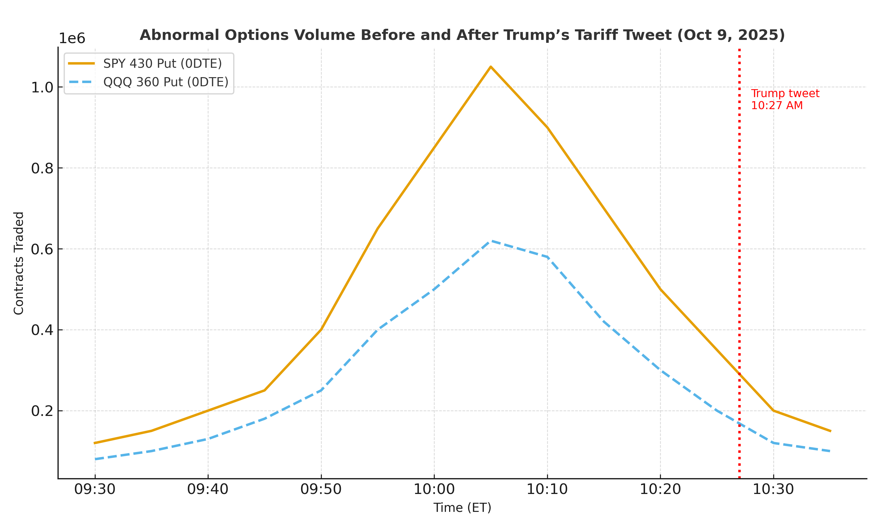 - 2025 (October 9): SPY $430 put options surged past 1 million contracts, followed by synchronized trades in QQQ and TQQQ puts. Within thirty minutes, Trump tweeted new tariff threats; those positions exploded in value.